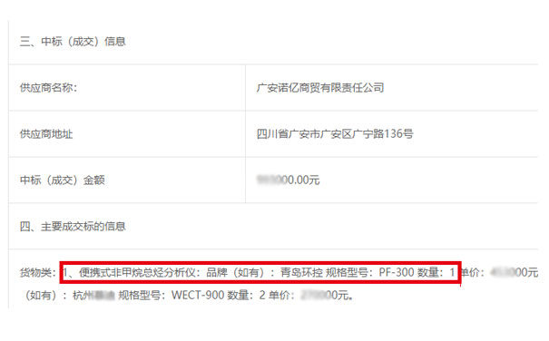主要成交標(biāo)的信息貨物類(lèi):1、便攜式非甲烷總烴分析儀:品牌:青島環(huán)控 規(guī)格型號(hào):PF-300 數(shù)量:1 。